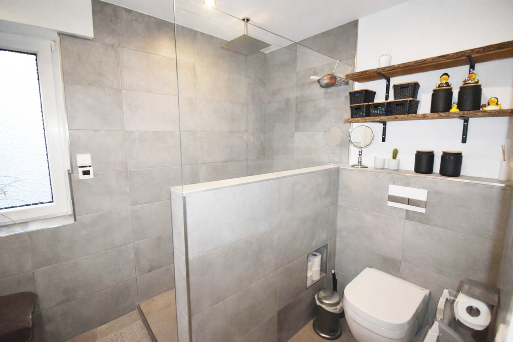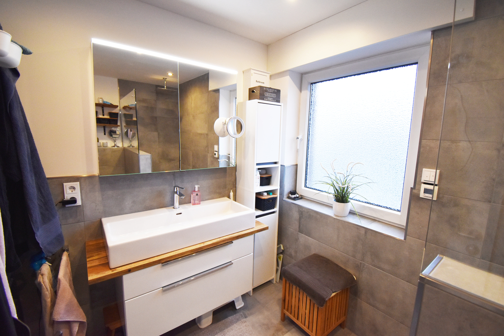 Außerdem befindet sich hier im Obergeschoss ein 2019 modernisiertes Bad mit begehbarer Dusche und großem Waschbecken. Die Wände im Bad sind halb hoch und in der Dusche bis zur Decke gefliest.