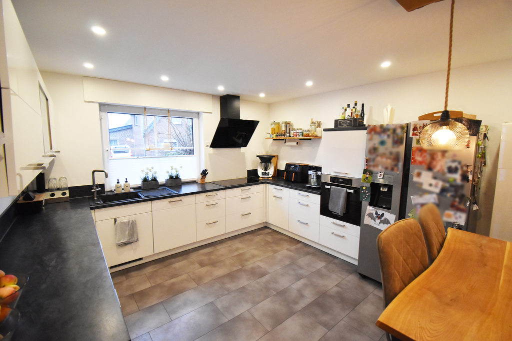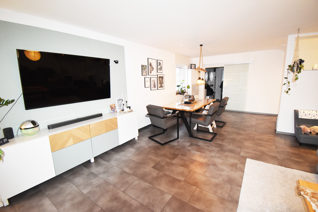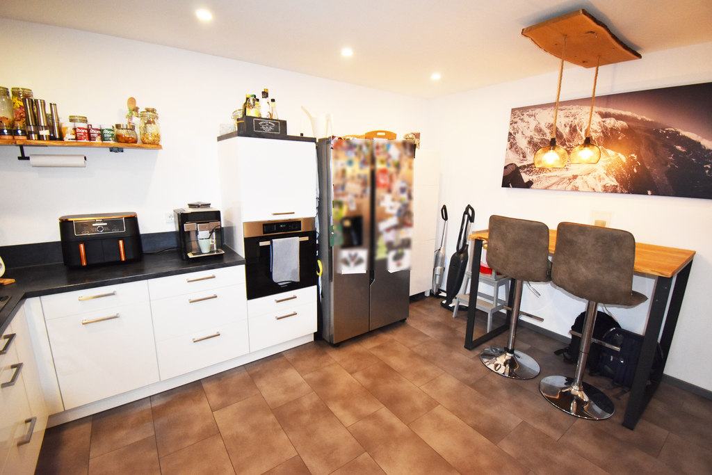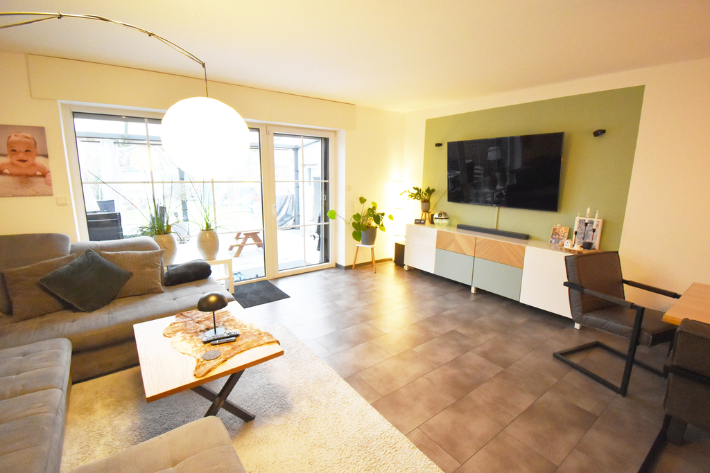 Im Erdgeschoss befindet sich eine geräumige Küche, welche im Jahr 2019 offen und modern gestaltet wurde. Die hochwertige Einbauküche ist im Kaufpreis enthalten. Weiter befinden sich im Erdgeschoss das renovierte Gäste-WC und der großzügige Wohn-Essbereich, von dem man durch das Panoramafenster einen hervorragenden Blick auf den Garten hat. Die gemütliche Terrasse, welche im Jahr 2021 mit einer festen Aluminium-Überdachung versehen wurde, und den daran anschließenden Garten betritt man direkt vom Wohnzimmer aus. Dieser Bereich lädt Sie sofort zum Entspannen und Ihre Kinder zum Spielen ein.