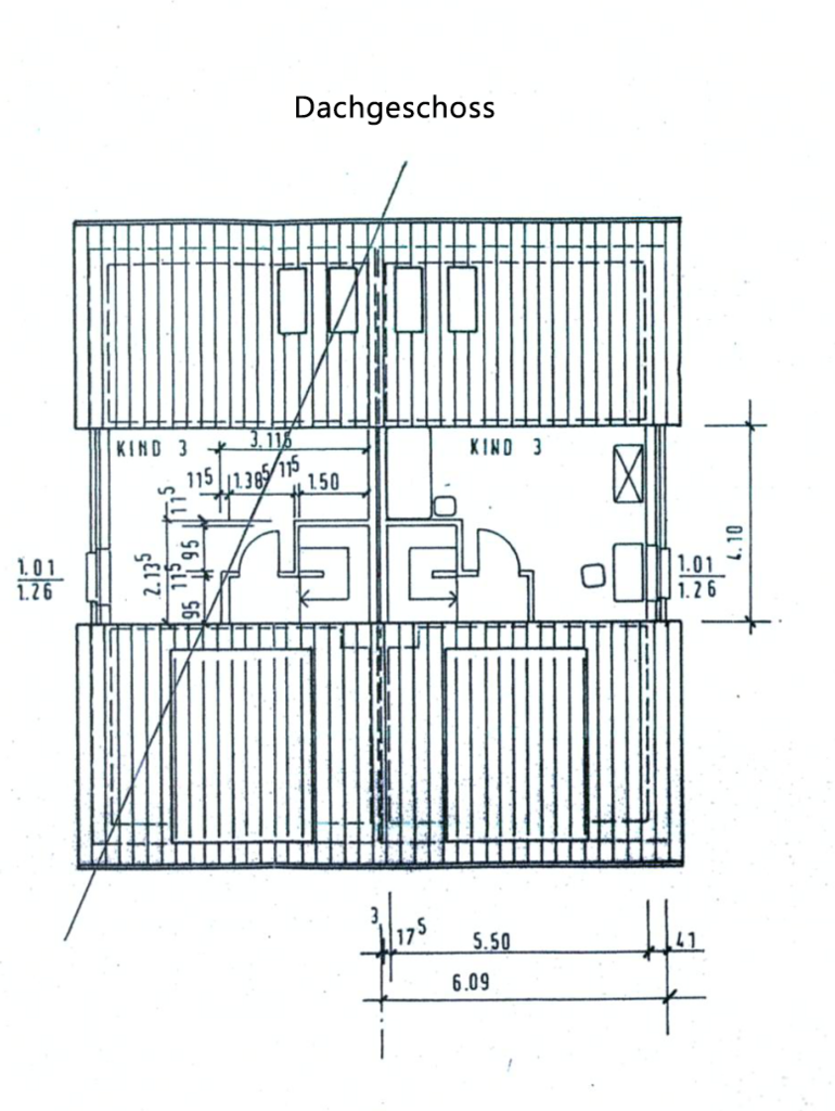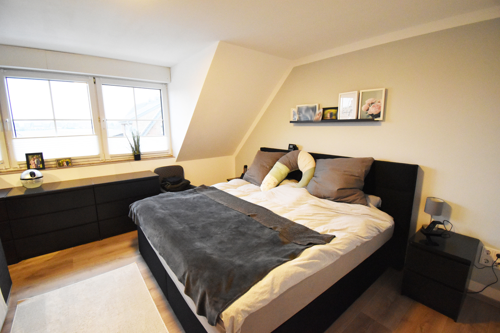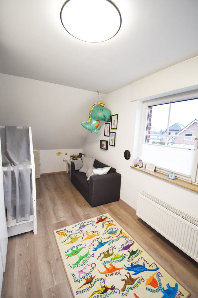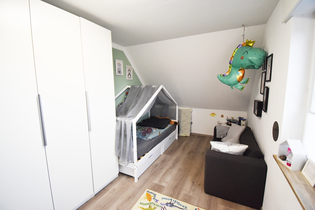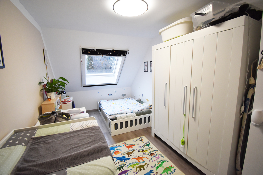Das Obergeschoss, dessen Fußboden mit modernem Laminat versehen ist, teilt sich in 3 Räume, ein Elternschlafzimmer und 2 Kinderzimmer.